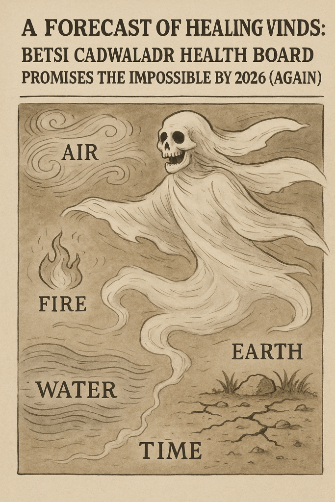 Tags: #NHSWales #BetsiCadwaladr #Satire #Elements #GhostlyDeadlines #HealthPolitics #AirApparent