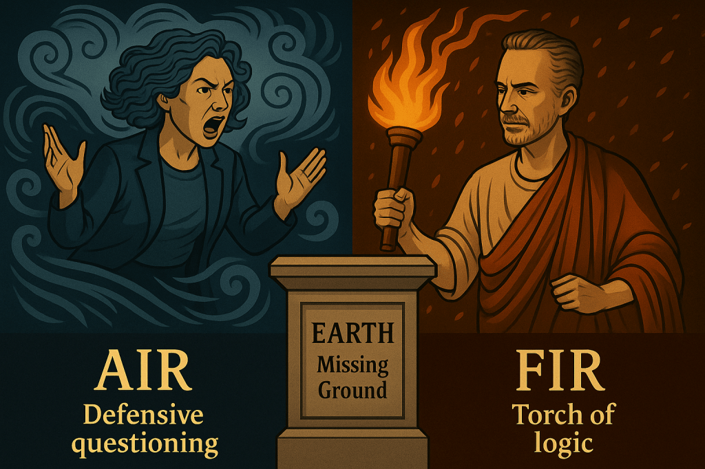She tried to outmaneuver the flame with quick pivots, but Air without grounding becomes a storm. And in this storm, the audience saw the wind twisting words rather than seeking clarity.