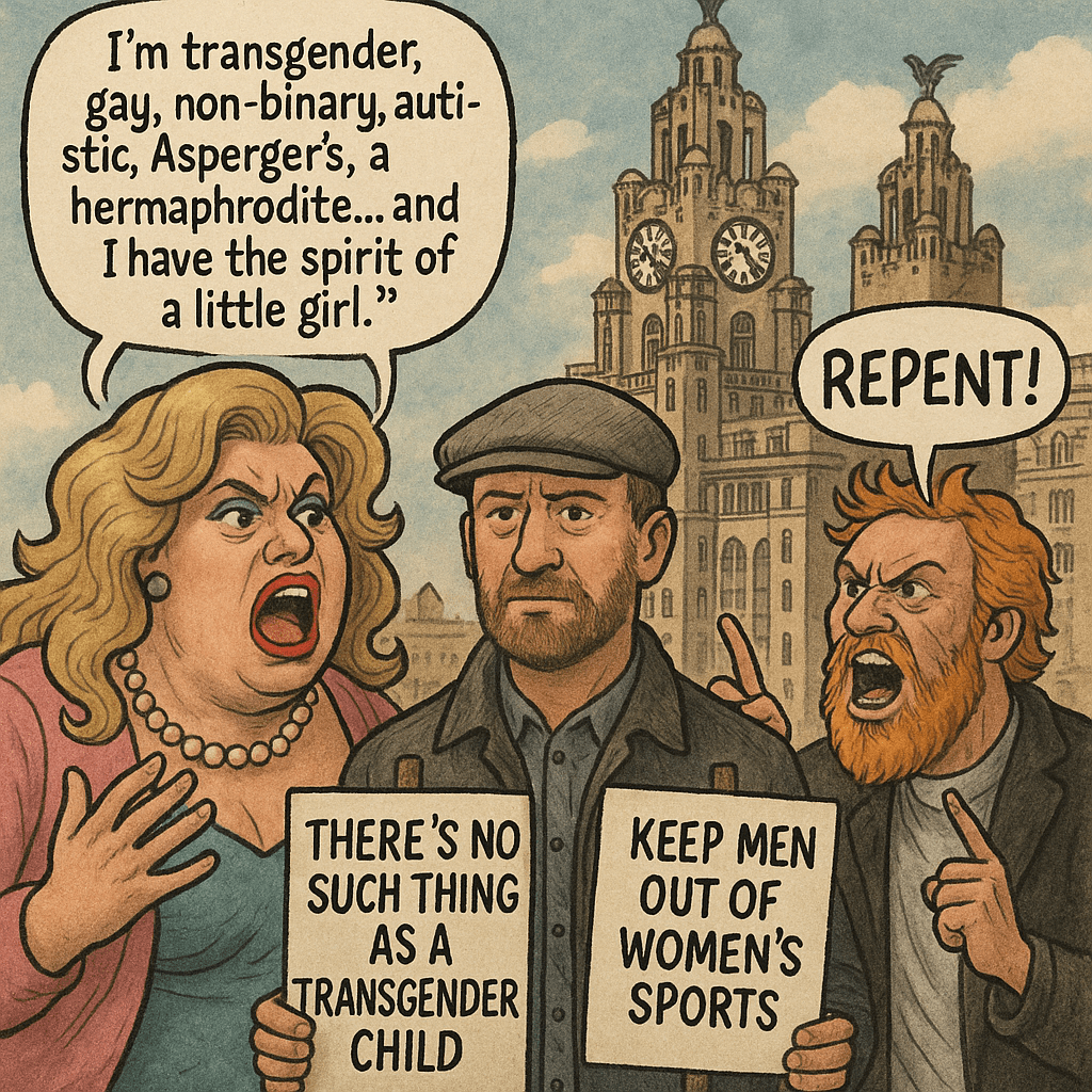 This chapter unfolds as myth and madness collide on the streets of Liverpool. Air is the dominant element — but it is Babel, not breath: language disintegrated into performative identity layers. Fire erupts on both sides: the glittering flamboyance of a collapsing self, and the religious blaze of righteous warning. Water drowns in excess, overflowing with sentiment unanchored to truth. And Earth, again, is gone — nothing solid remains. The Watchman does not intervene. He bears witness to the theatre of modernity — a sacred absurdity that must be remembered to be healed.
